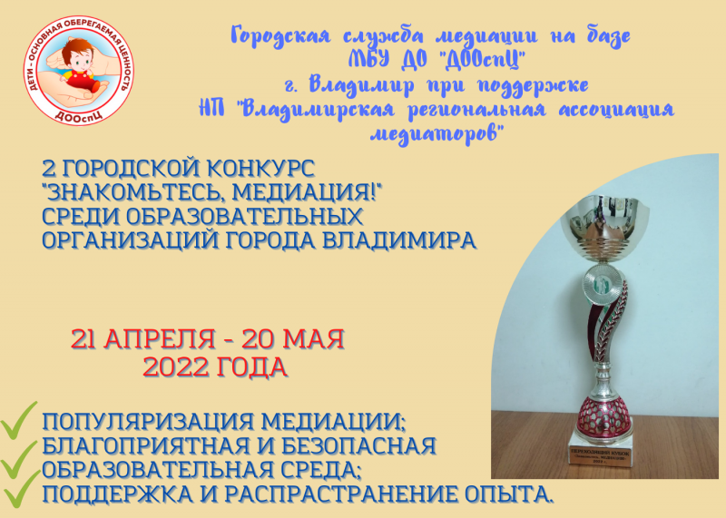Победителю Конкурса будет вручен переходящий кубок «Знакомьтесь, МЕДИАЦИЯ! 2022. Напомним, что в прошлом году победителем стала МАОУ "СРЕДНЯЯ ОБЩЕОБРАЗОВАТЕЛЬНАЯ ШКОЛА N°2" г. Владимира.