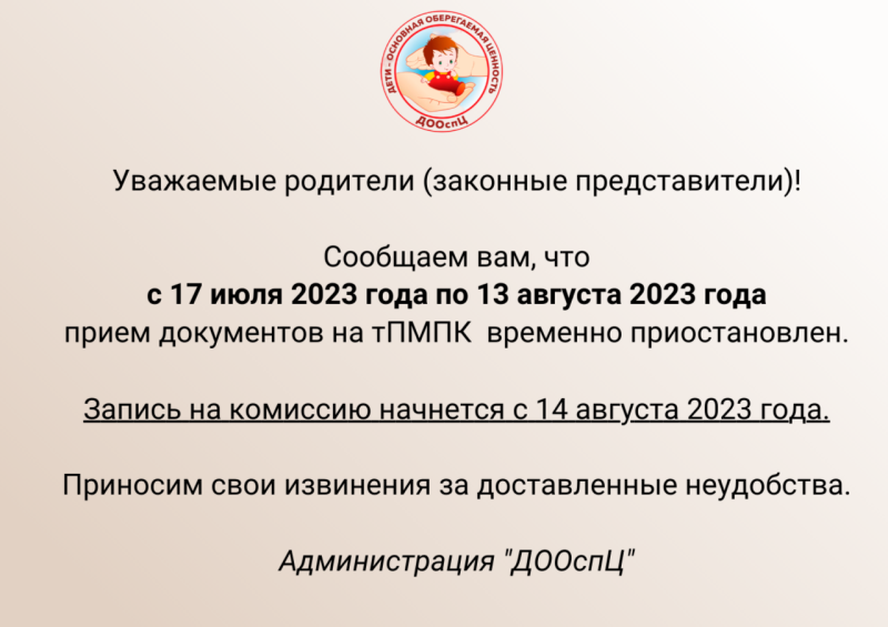 Сообщаем вам, что с 17 июля 2023 года по 13 августа 2023 года прием документов на тПМПК временно приостановлен.