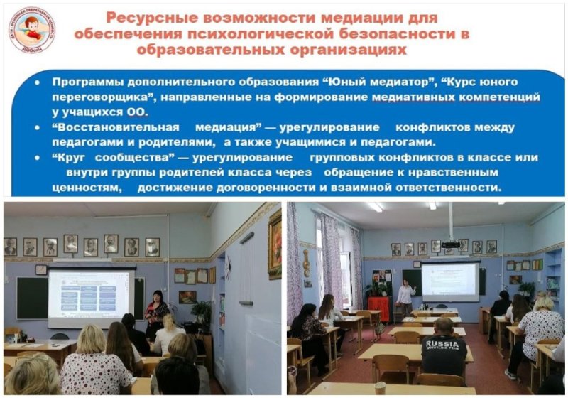 08.11.2023 года в рамках сотрудничества с Городским информационно-методическим центром https://gimc.ru/ на базе МБОУ СОШ№13 города Владимира https://t90750s.sch.obrazovanie33.ru/ прошла презентация программ Детского оздоровительно-образовательного Центра, направленных на формирование бесконфликтного образовательного пространства. Информацией о возможностях отработки практических компетенций по бесконфликтному взаимодействию, о сообществах практиков, где можно вместе находить ответы на сложные вопросы, о ресурсных возможностях Клуба практикующих школьных медиаторов+ и занятиях в формате тренинга "Повышение профессиональной компетенции" поделились со своими коллегами заместитель директора по УВР , рук. Городской службы медиации МБУ ДО "ДООспЦ" - Сикати-Журавлева Наталья Евгеньевна, и педагог-психолог высшей квалификационной категории - Зверева Татьяна Борисовна.