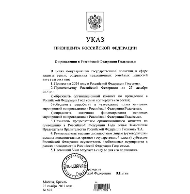 2024 объявлен годом семьи — указ Президента РФ Владимира Владимировича Путина.
