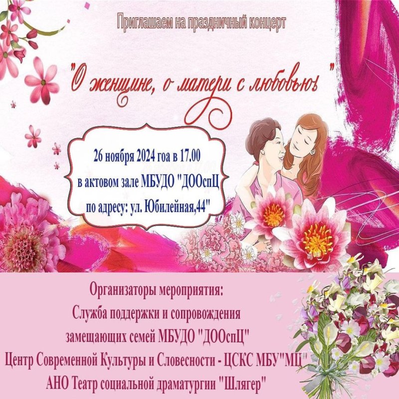 Мы с радостью сообщаем о предстоящем вечере, посвященном самому теплому и искреннему празднику — Дню Матери! Это событие станет настоящим подарком для всех мам и семей, и мы приглашаем вас отметить этот день вместе с нами!