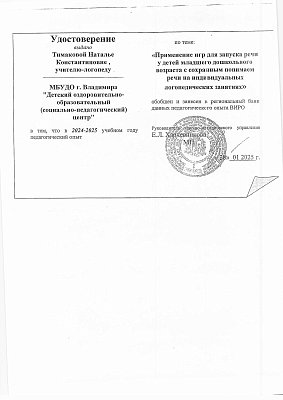 Учитель-логопед МБУДО "ДООспЦ" обобщила в 2024-2025 учебном году педагогический опыт по теме: "Применение игр для запуска речи у детей младшего дошкольного возраста с сохранным пониманием речи на индивидуальных логопедических занятиях".