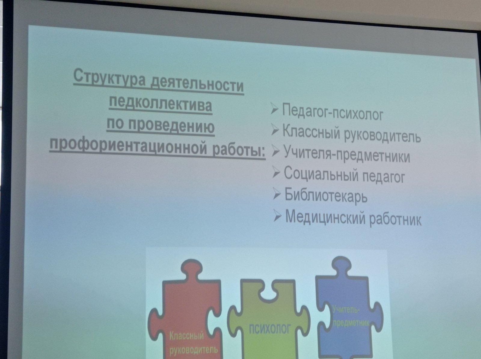 В докладе была отражена системная работа, включающая диагностику склонностей, профессиональные пробы, экскурсии на предприятия, встречи со специалистами и помощь в самоопределении. Работа педагога-психолога строится с использованием платформы «Билет в будущее» (профминимум) и включает работу с родителями. Опыт вызвал большой интерес у присутствующим и получил положительную оценку.