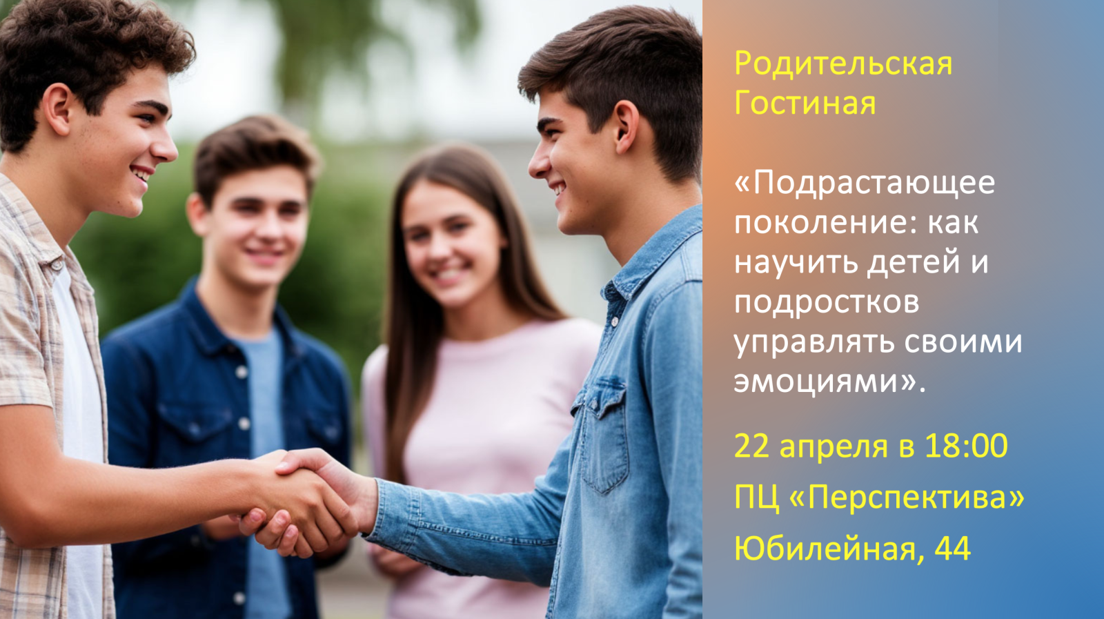 Уважаемые родители, приглашаем вас 22 апреля в 18:00 на очередное заседание Родительской Гостиной по теме «Подрастающее поколение: как научить детей и подростков управлять своими эмоциями».