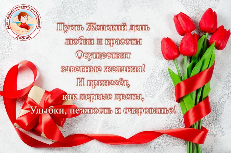 Дорогие женщины! МБУДО «ДООспЦ» г. Владимир поздравляет вас с самым прекрасным днём в году – 8 марта! Желаем вам, чтобы каждый день был наполнен яркими красками, солнечным настроением и позитивом. Пусть в вашей жизни будет много любви, здоровья, успеха и благополучия. Пусть все ваши мечты сбываются, а каждый новый день приносит только радость и улыбки. Спасибо за вашу теплоту, заботу и нежность. Вы – настоящие чудеса, которые делают наш мир ярче и красивее! С праздником!