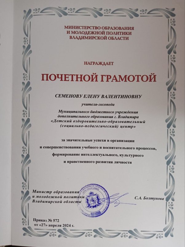 Почетная грамота учителя-логопеда Семеновой Е.В.