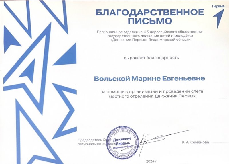 Благодарственное письмо Вольской Марине Евгеньевне