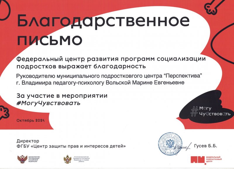Благодарственное письмо Вольской Марине Евгеньевне