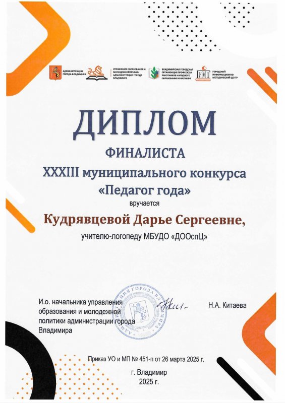 Диплом финалиста конкурса "Педагог года" Кудрявцевой Д.С.